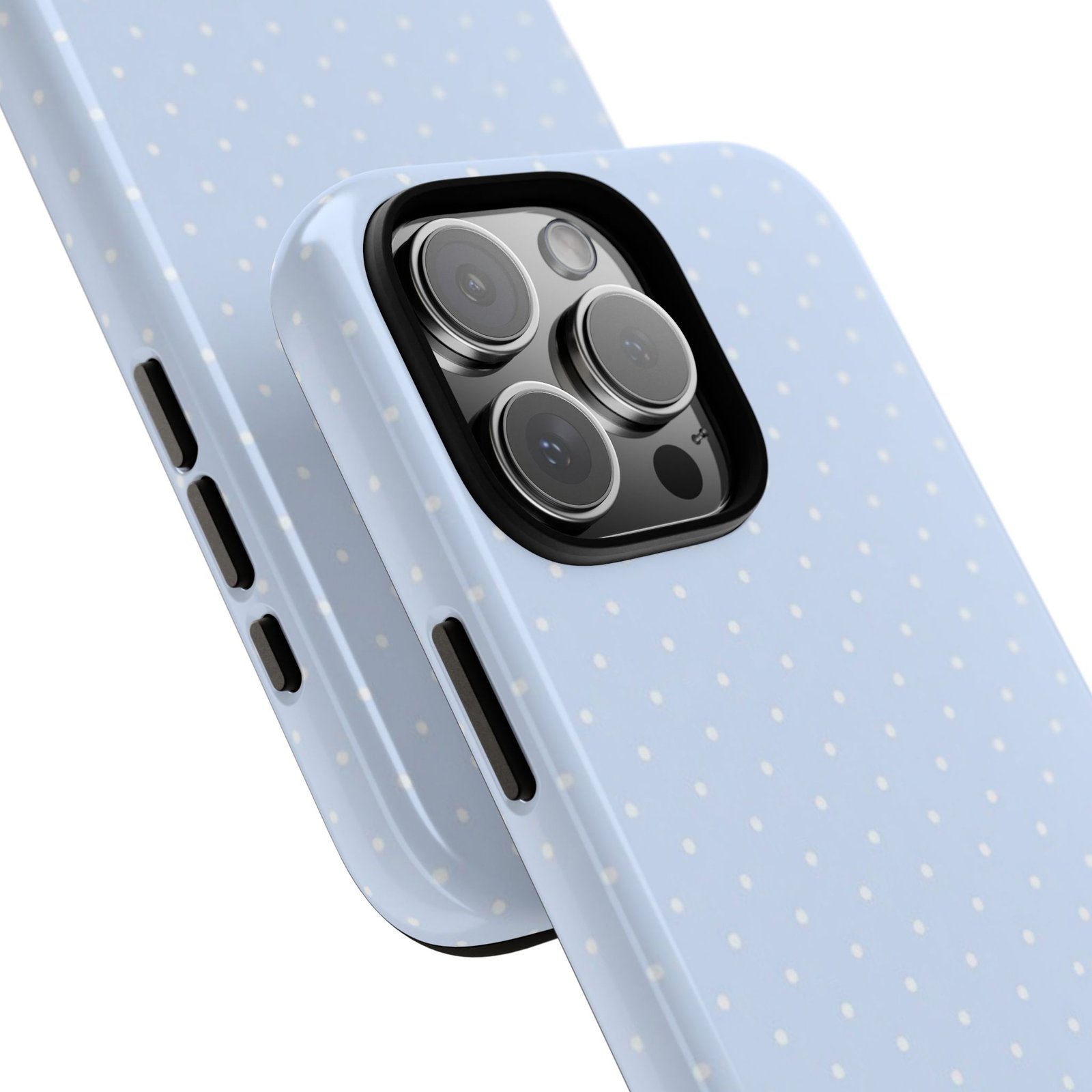 A slim, protective phone case that blends subtle style with everyday toughness. The soft pastel-blue base and tiny white polka dots give it a gentle, vintage-inspired look, while the dual-layer construction (polycarbonate shell + TPU silicone liner) absorbs shocks and guards against drops. The design keeps the pattern continuous around edges, and UV protection helps the color stay true outdoors. It accepts wireless charging and keeps ports accessible, making this case both practical and quietly stylish for someone who prefers calm, classic design with reliable protection.